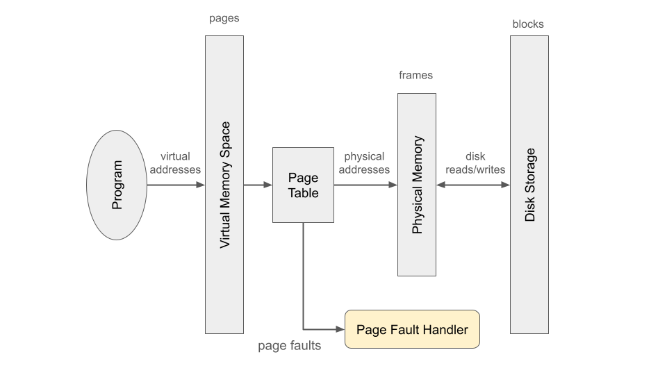 In this project, you will build a simple but fully functional demand paged virtual memory. Although virtual memory is normally implemented in the operating system kernel, it can also be implemented at the user level. (With a few limitations.) This is the same technique used by modern virtual machines, so you will be learning an advanced technique without having the headache of writing kernel-level code. The following figure gives an overview of the components: