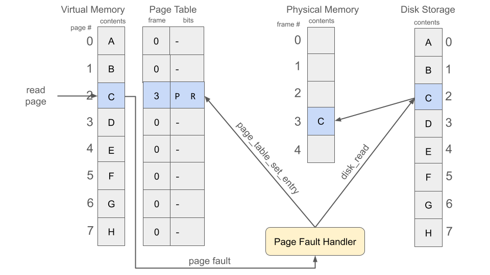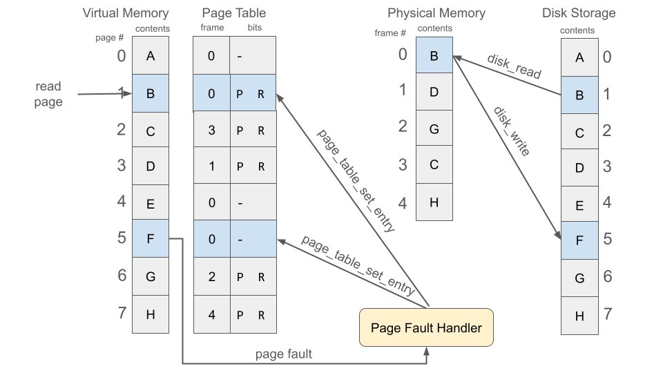 Begin by downloading the source code and building it. Look through main.c and notice that the program simply creates a virtual disk and page table, and then attempts to run one of our four “programs” using the virtual memory. Because no mapping has been made between virtual and physical memory, a page fault happens immediately: