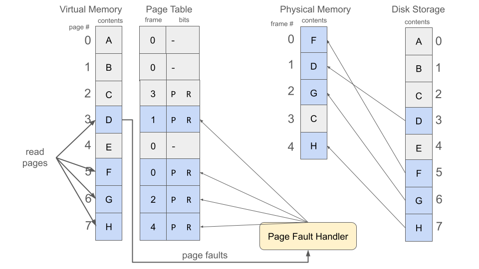 The application continues to run, reading various pages. Suppose that it reads pages 3, 5, 6, and 7, each of which result in a page fault, a page loaded into physical memory, and the appropriate bits set. Now physical memory is fully in use.