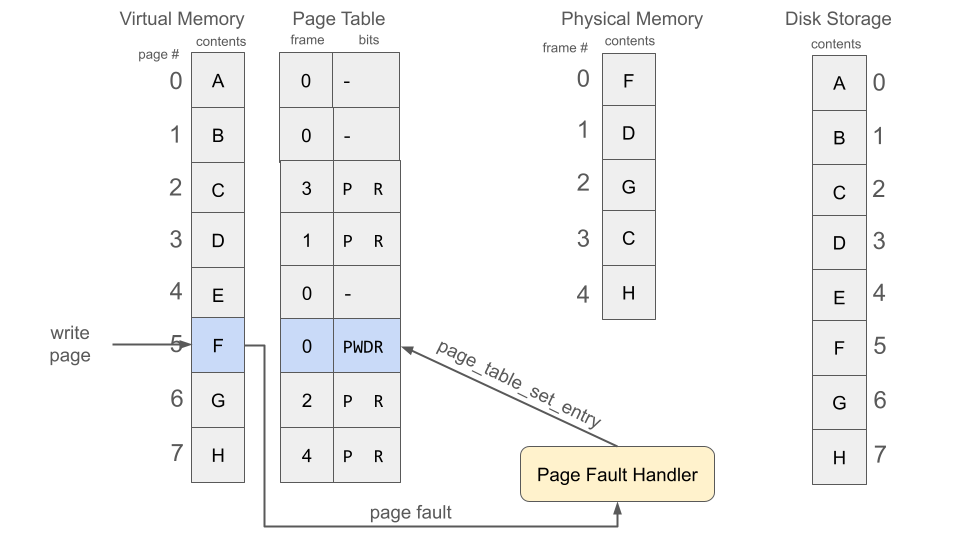 Then try this as a getting started exercise. If you run the program with an equal number of pages and frames, then you don’t actually need a disk. Instead, you can simply make page N map directly to frame N, and do nothing else. So, modify the page fault handler to provide a present and writable page, like this: